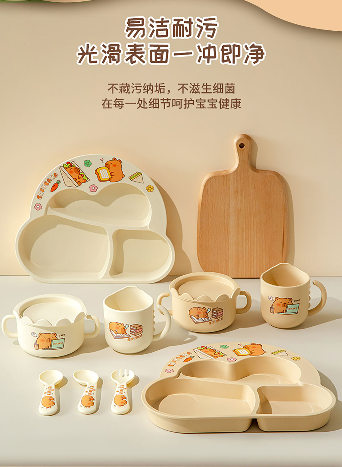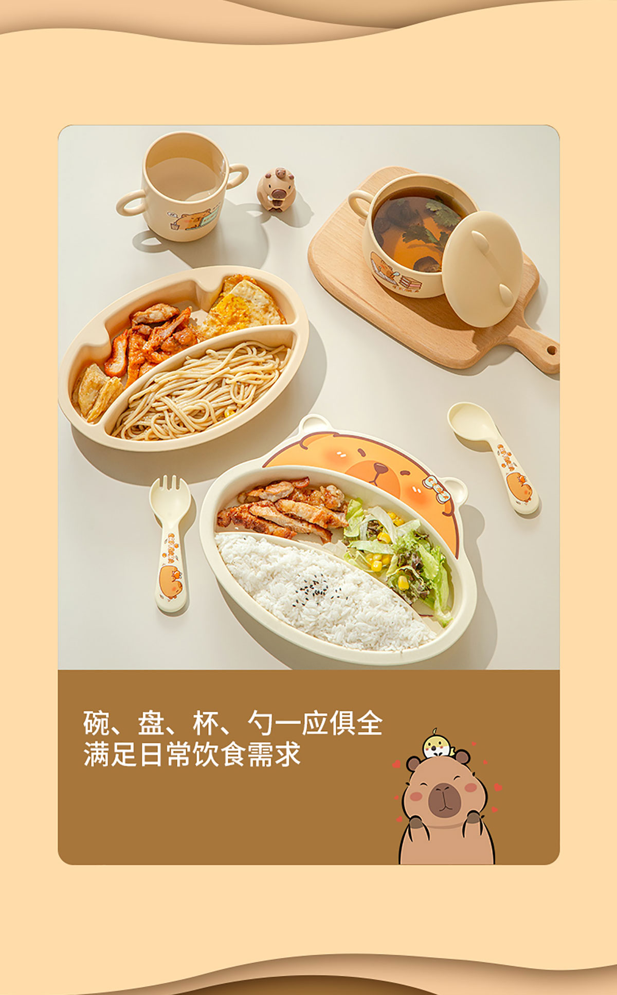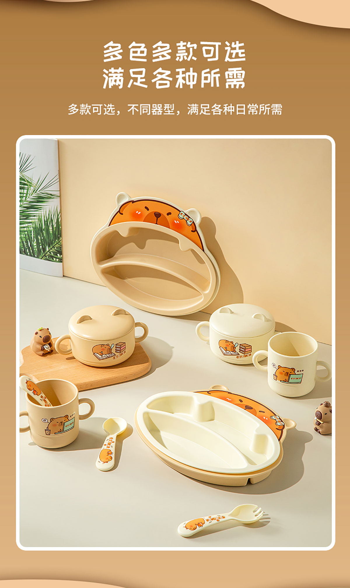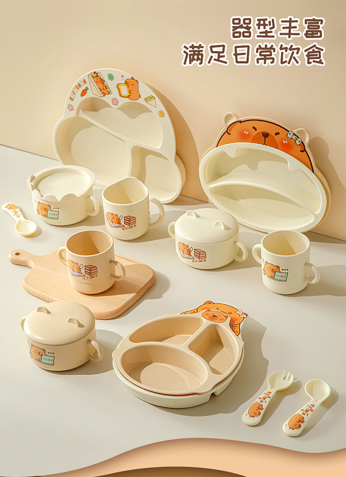 Size: HH-XJ8522(小俏豚):餐盤(pán)260*196*40mm/碗160*110*80mm/杯140*80*83mm/勺叉125mm