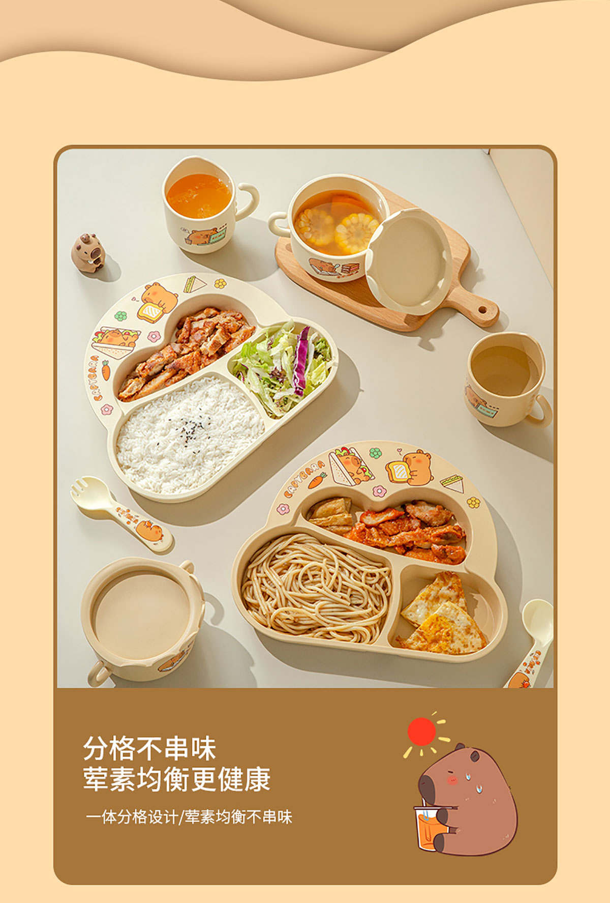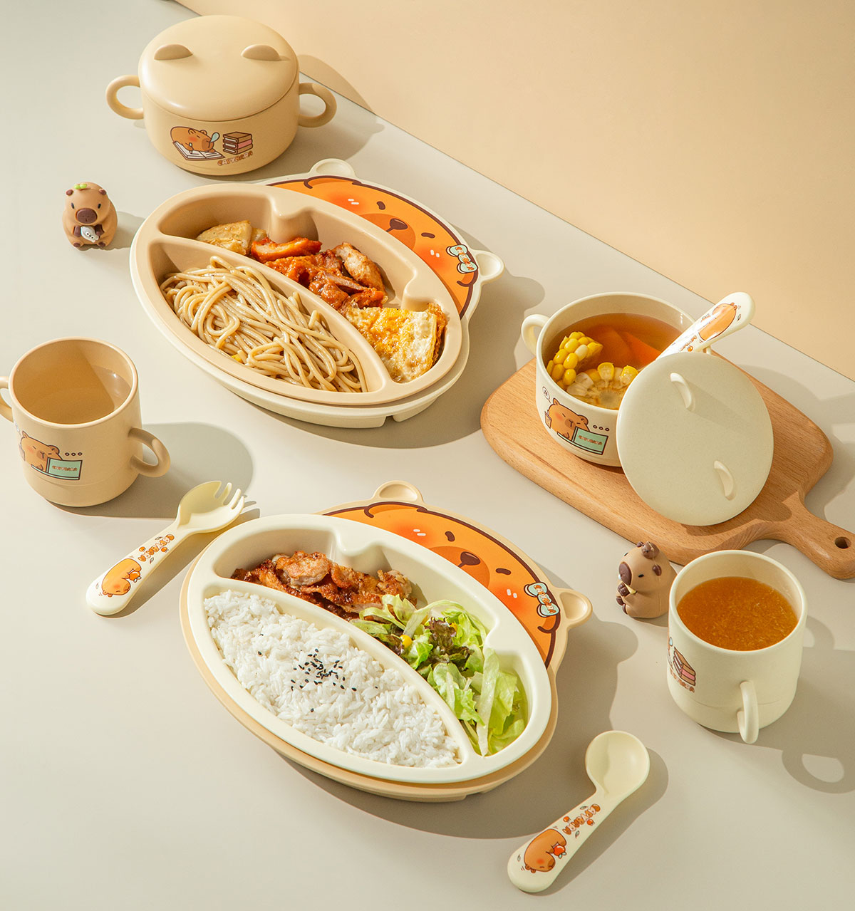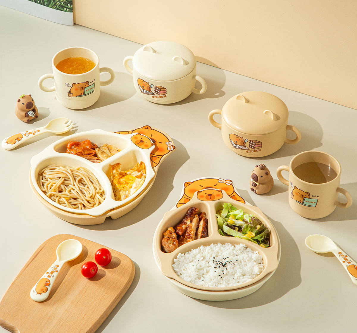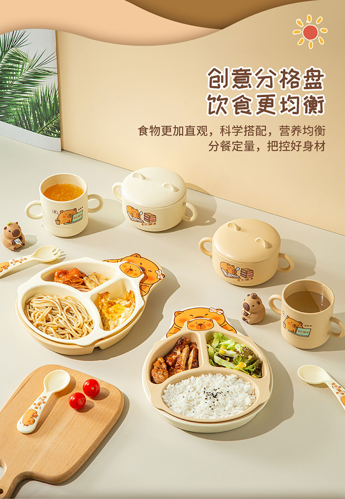 Size: HH-XJ8522(小俏豚):餐盤(pán)260*196*40mm/碗160*110*80mm/杯140*80*83mm/勺叉125mm