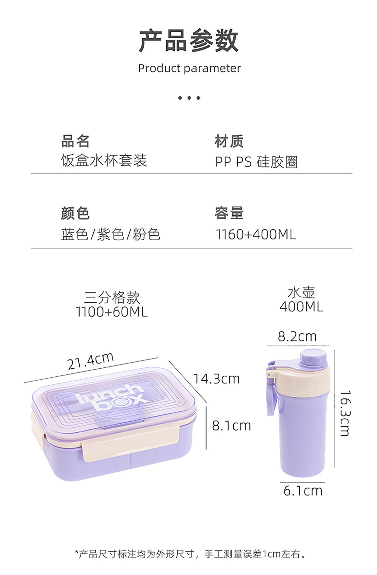 Size: 飯盒:214*143*81mm/1100ml 水壺:φ82*61*163mm/400ml